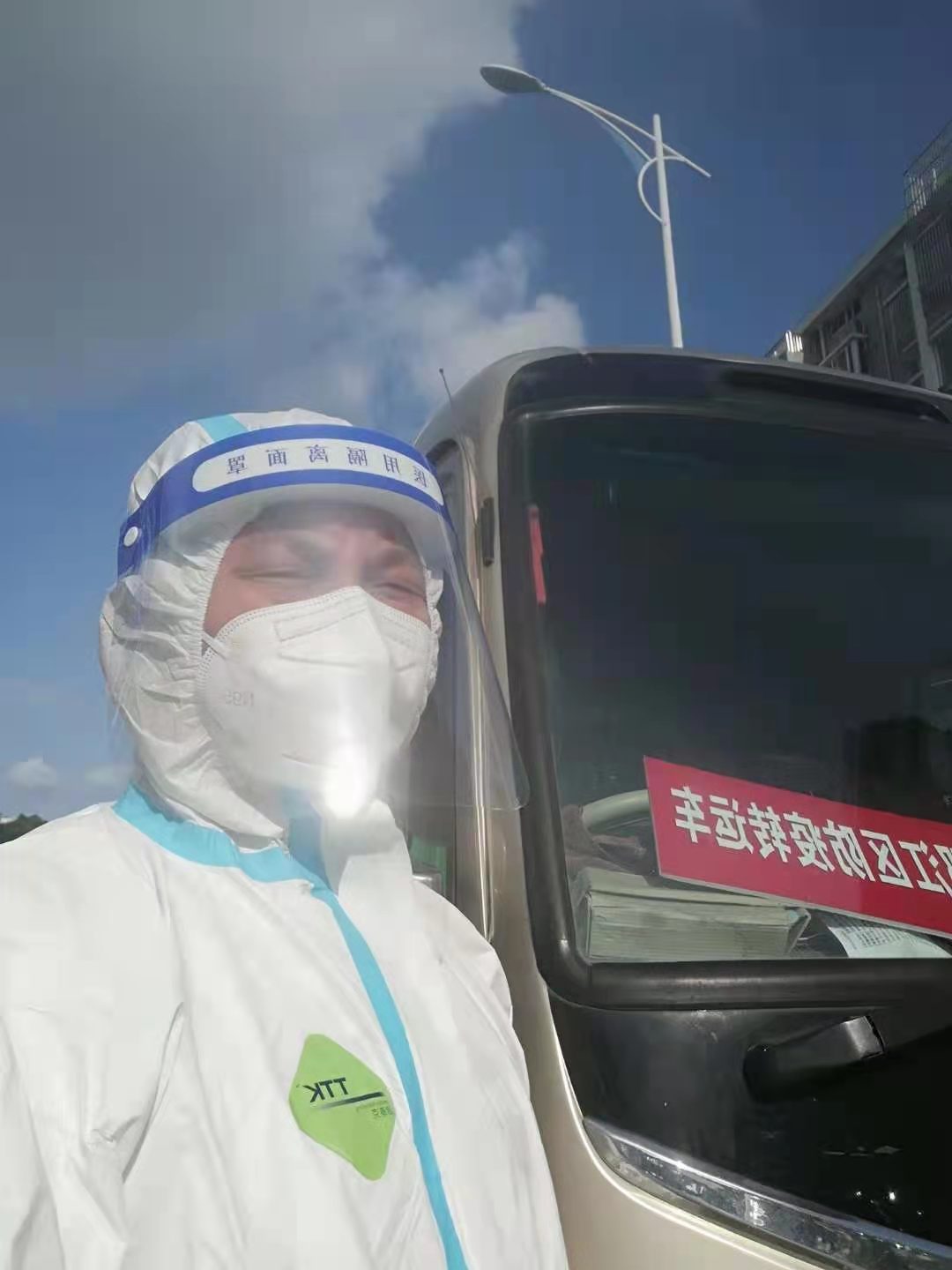 轉(zhuǎn)運(yùn)工作異常艱苦,尤其是轉(zhuǎn)運(yùn)初期,大量的人員需要轉(zhuǎn)運(yùn)至隔離區(qū),畢克駐在一線全天24小時(shí)待命,接到任務(wù)立即穿戴防護(hù)服出發(fā),最多的時(shí)候每天轉(zhuǎn)運(yùn)15趟次,只能睡三四個(gè)小時(shí)。疫情就是命令,生命重于泰山,防控的過程,就是與時(shí)間賽跑的過程。7、8月份正值高溫酷暑,他穿著封閉的防護(hù)服,一遍遍的從小區(qū)將次密者送到隔離點(diǎn),每轉(zhuǎn)接一次,就要換一身防護(hù)服,渾身的汗水揮發(fā)不掉,硬是悶在密閉的防護(hù)服中,一天下來,皮膚被汗水浸泡的發(fā)白,手掌反復(fù)蛻皮。高溫高濕的環(huán)境、高強(qiáng)度的工作所帶來的考驗(yàn)一般人難以忍受,而他卻日復(fù)一日重復(fù)著同樣的經(jīng)歷。